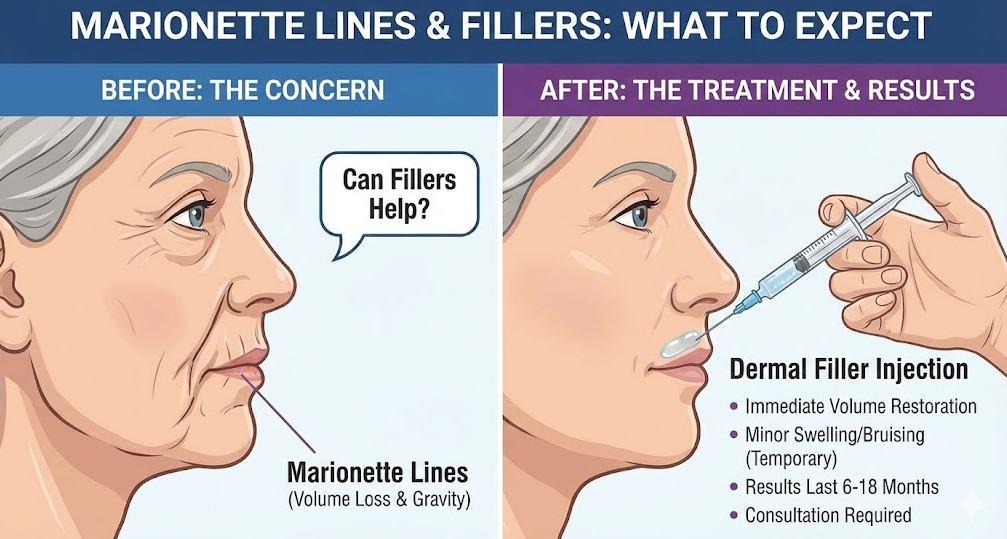 Yes, dermal fillers are one of the most effective treatments for marionette lines. These lines run from the corners of your mouth down toward your chin, often creating a sad or tired appearance. Fillers restore lost volume in the lower face, lifting the corners of the mouth and softening these downward lines. Results are visible immediately and typically last 9 to 12 months.